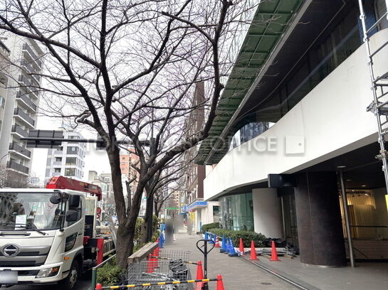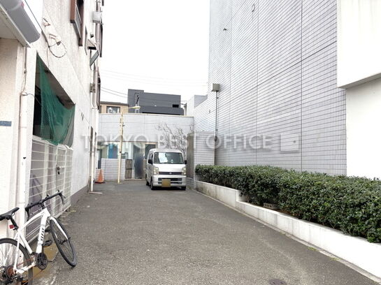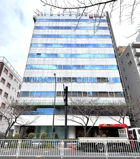 明治通り沿い、基準階約150坪。白い外観のオフィスビル。