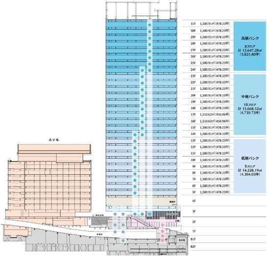 高層・中層・低層にエレベーターバンクが分割され、3階オフィスロビーから各フロアまでスムーズに移動可能。エレベーターは計18台(うち2台は非常用兼用)稼働予定です。